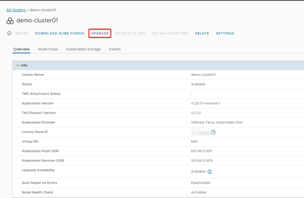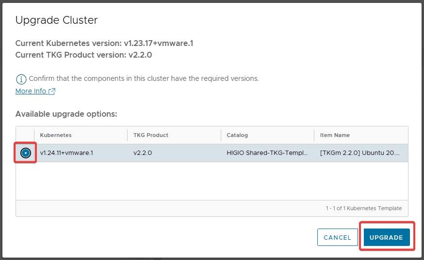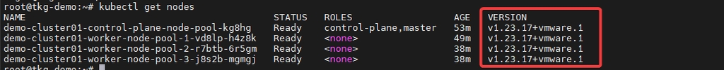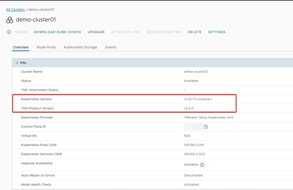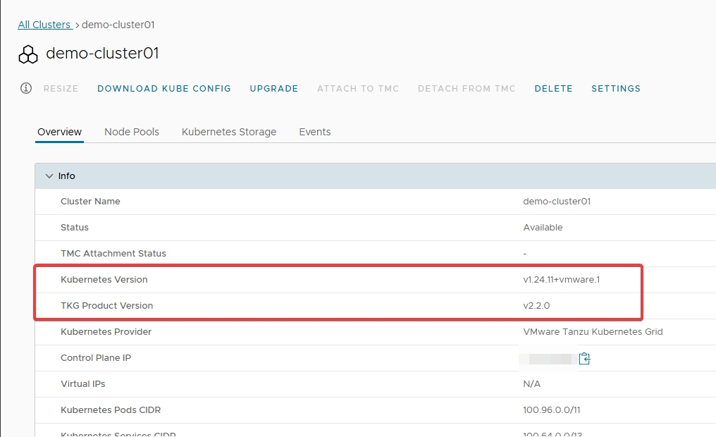 Bước 4: Xác minh rằng phiên bản Kubernetes và TKG Product hiện tại được sử dụng là chính xác.