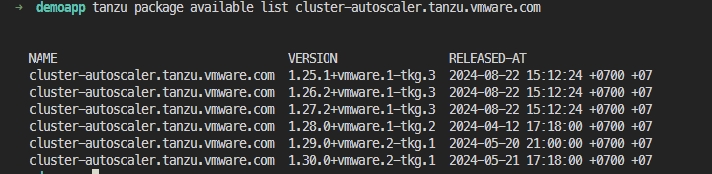 Liệt kê các phiên bản cluster-autoscaler có sẵn trong gói tanzu và ghi lại tên phiên bản