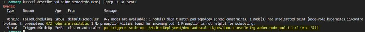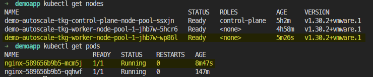 Normal TriggeredScaleUp 2m43s cluster-autoscaler pod triggered scale-up: [{MachineDeployment/demo-autoscale-tkg-ns/demo-autoscale-tkg-worker-node-pool-1 1->2 (max: 5)}]kubectl delete -f test-autoscale.yaml