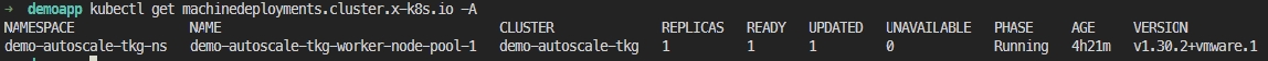 Normal TriggeredScaleUp 2m43s cluster-autoscaler pod triggered scale-up: [{MachineDeployment/demo-autoscale-tkg-ns/demo-autoscale-tkg-worker-node-pool-1 1->2 (max: 5)}]