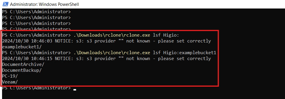 .\Downloads\rclone\rclone.exe lsf Higio:examplebucket1