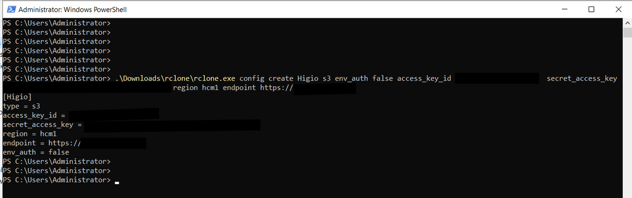 .\Downloads\rclone\rclone.exe config create Higio s3 env_auth false access_key_id xxxxxxxxxxxxxx secret_access_key xxxxxxxxxxxxxxxxxxx region default endpoint https://xxx.xxx.xx