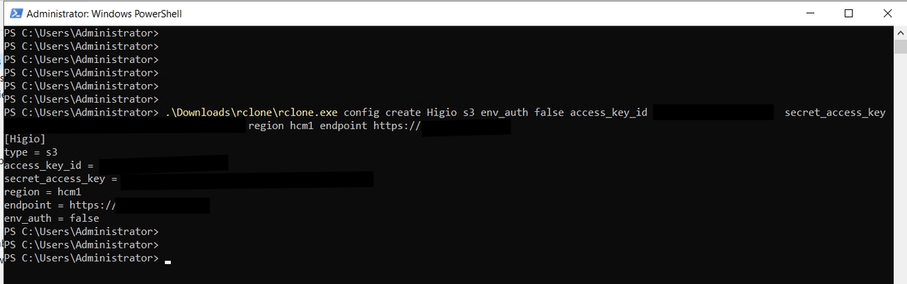 .\Downloads\rclone\rclone.exe config create Higio s3 env_auth false access_key_id xxxxxxxxxxxxxx secret_access_key xxxxxxxxxxxxxxxxxxx region hcm1 endpoint https://xxx.xxx.xx** Lưu ý: “ .\Downloads\rclone\rclone.exe" là đường dẫn thư mục chứa công cụ RClone.
