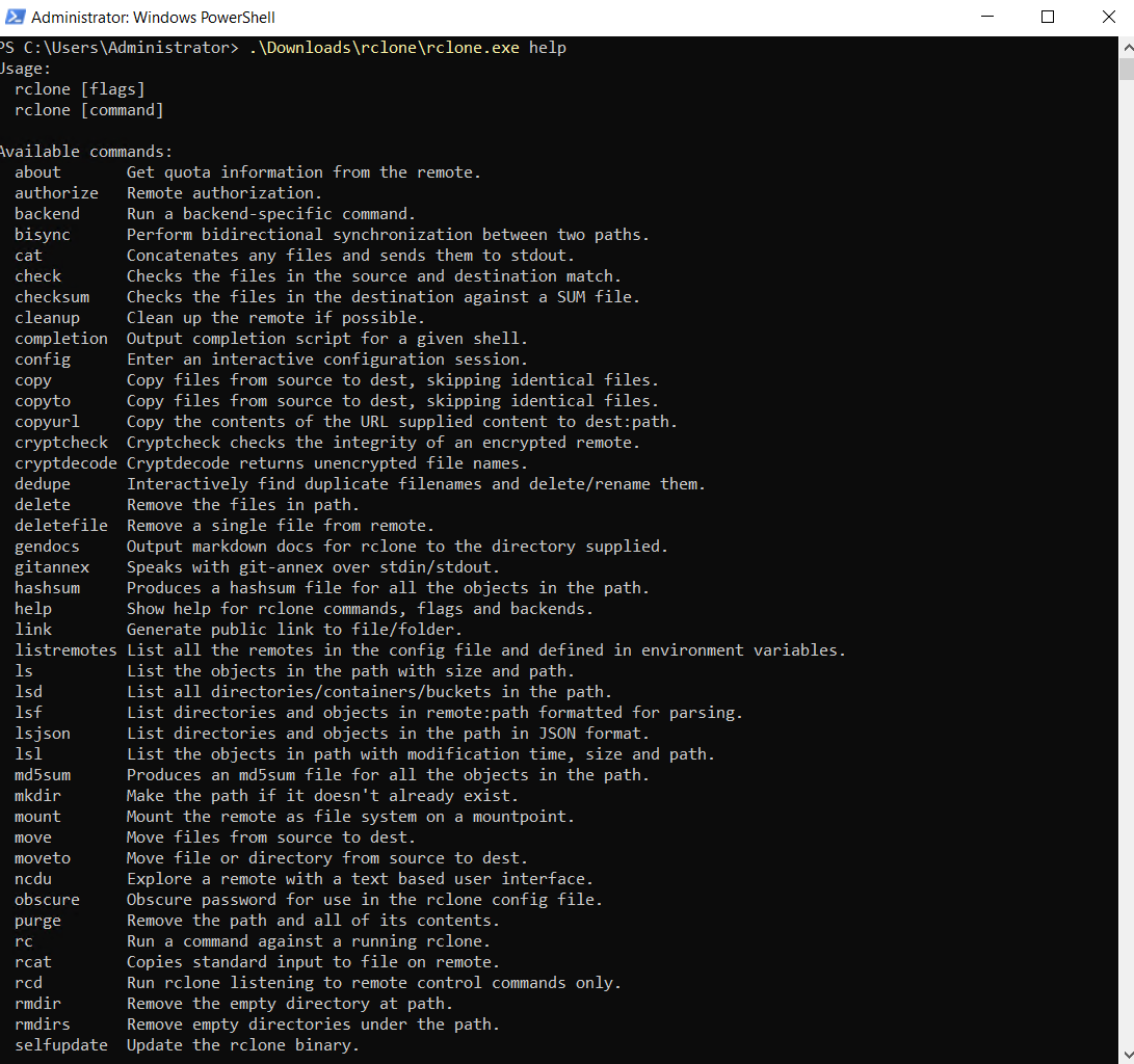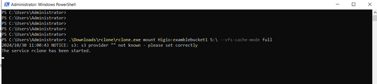 "C:\Users\Administrator".\Downloads\rclone\rclone.exe mount Higio:examblebucket1 S:\ --vfs-cache-mode fullLast updated
