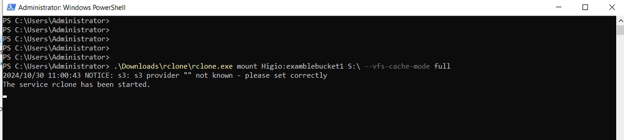 "C:\Users\Administrator".\Downloads\rclone\rclone.exe mount Higio:examblebucket1 S:\ --vf