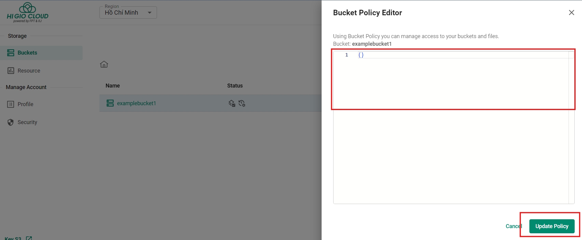 Bước 2: Bạn có thể sửa đổi chính sách Bucket theo yêu cầu trong cửa sổ popup này. Sau khi đã thực hiện các thay đổi cần thiết, nhấp vào "Update Policy" để áp dụng các cập nhật.