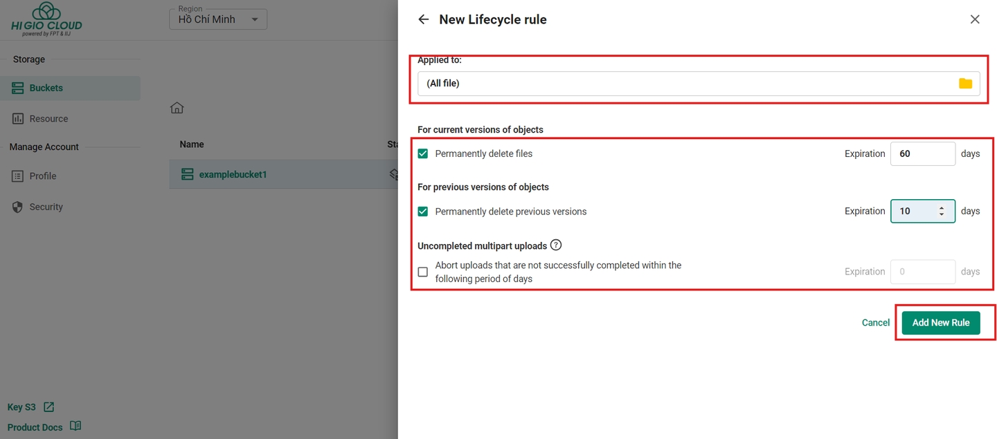 Bước 3: Thiết lập các quy tắc bạn muốn áp dụng cho Bucket và đặt số ngày cần áp dụng. Sau khi chọn quy tắc, nhấp vào “Add New Rule”.