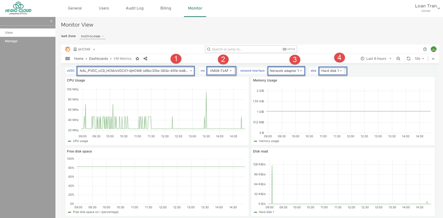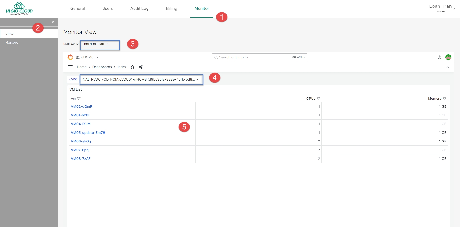 Trong cửa sổ Monitor View, bạn có thể chọn: IaaS Zone [3], oVDC [4] mà bạn muốn xem.