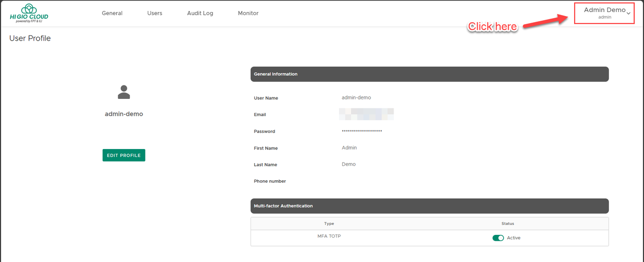 Ở góc trên bên phải của cổng HI GIO IAM, nhấp vào tên của bạn.