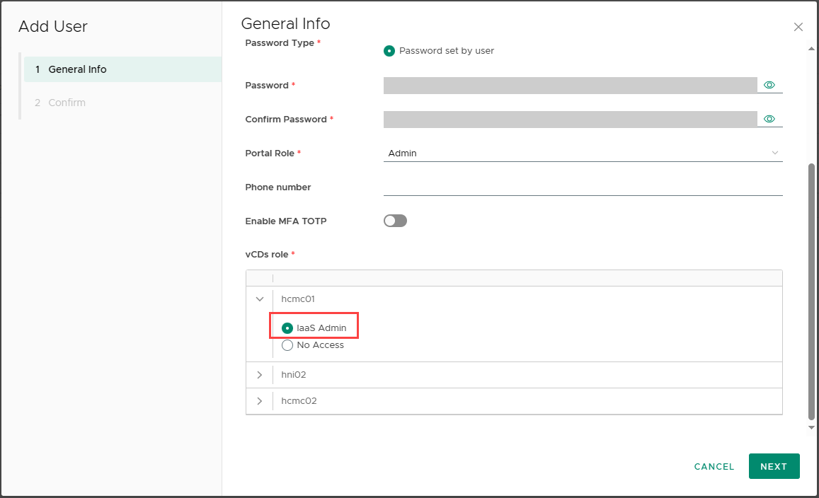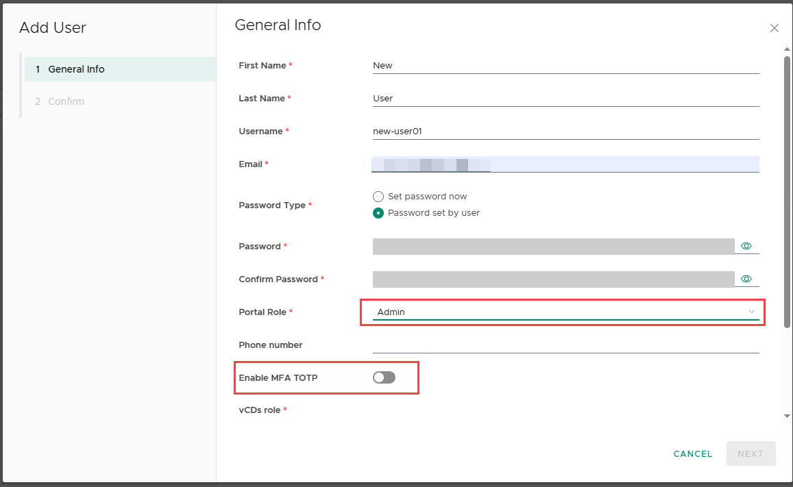Điền thông tin, chọn vai trò cho Portal Role. Nếu muốn sử dụng MFA, bạn cần kích hoạt MFA TOTP.