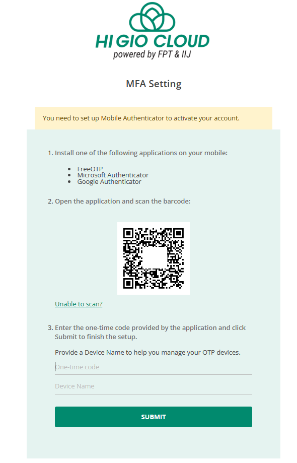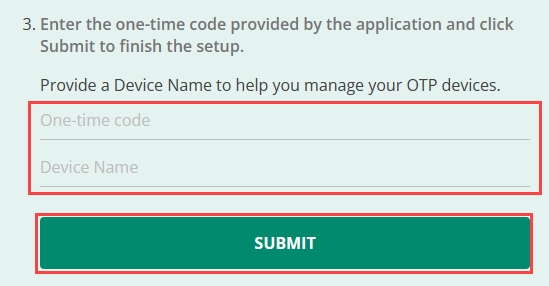 Nhập mã một lần (one-time code) được cung cấp bởi ứng dụng (Tên thiết bị - tùy chọn) và nhấn Submit để hoàn tất việc thiết lập.