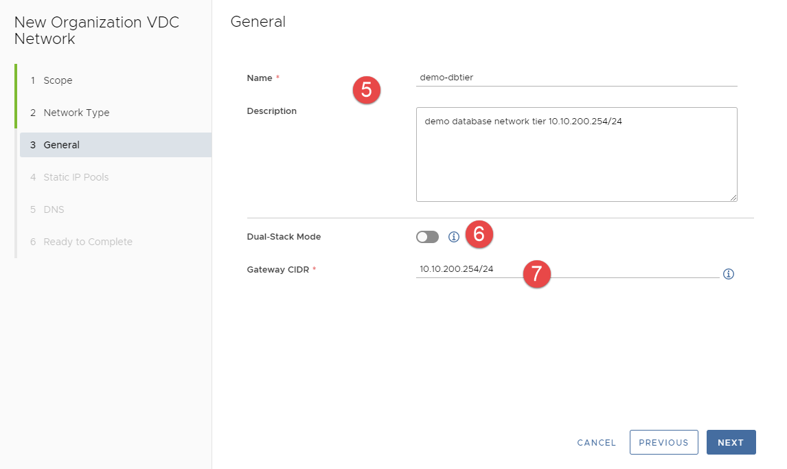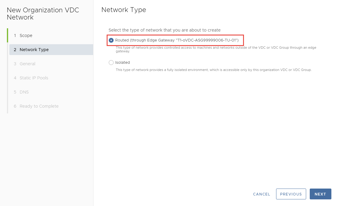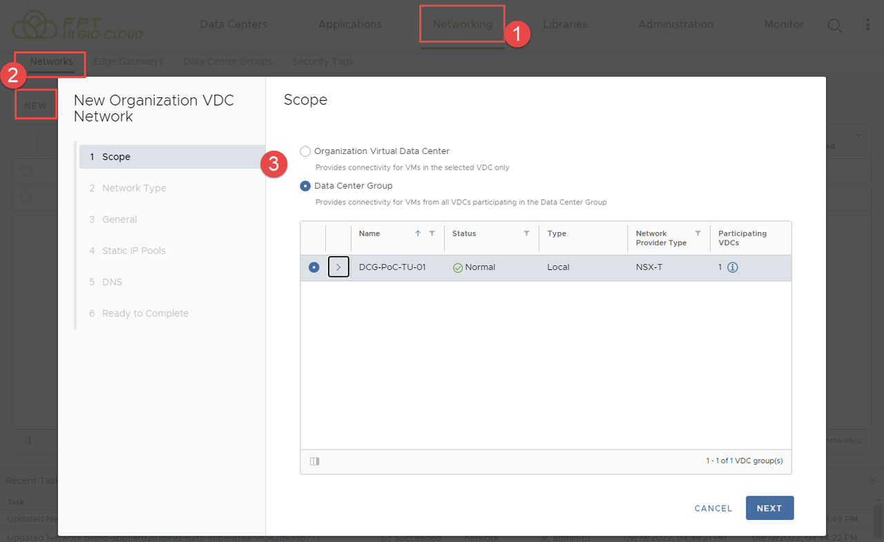 Trong trang Scope, chọn Organization Virtual Data Center hoặc Data Center Group để tạo mạng, sau đó nhấp Next.xt