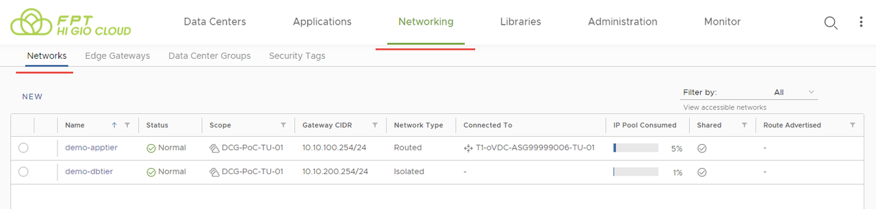 Bước 3: Xem danh sách mạng Organization VDC khả dụngs