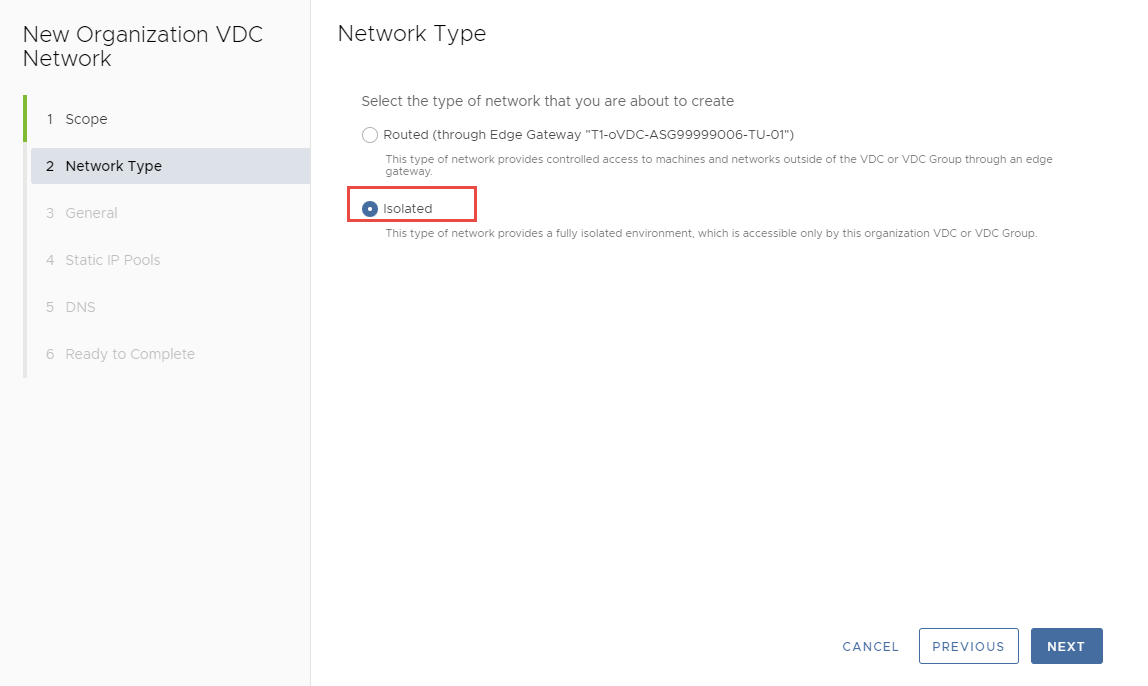 Trong trang Select Network Type, chọn Isolated >> Next.