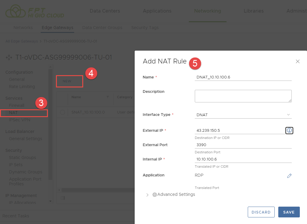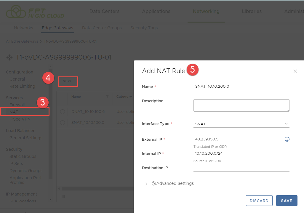 Lưu ý: Các địa chỉ IP public phải được thêm vào giao diện edge gateway nơi bạn muốn thêm quy tắc NAT.