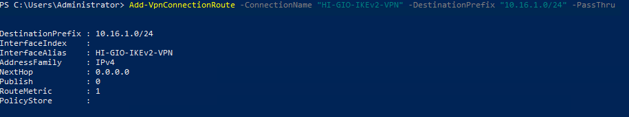 Add-VpnConnectionRoute -ConnectionName "HI-GIO-IKEv2-VPN" -DestinationPrefix "10.16.1.0/24" -PassThru