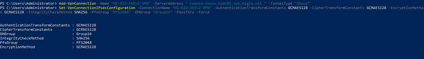 Set-VpnConnectionIPsecConfiguration -ConnectionName "HI-GIO-IKEv2-VPN" -AuthenticationTransformConstants GCMAES128 -CipherTransformConstants GCMAES128 -EncryptionMethod GCMAES128 -IntegrityCheckMethod SHA256 -PfsGroup "PFS2048" -DHGroup "Group14" -PassThru -Force