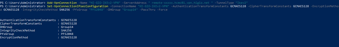 Add-VpnConnection -Name "HI-GIO-IKEv2-VPN" -ServerAddress " remote-xxxxx.xxxx01.vpn.higio.net " -TunnelType "Ikev2"