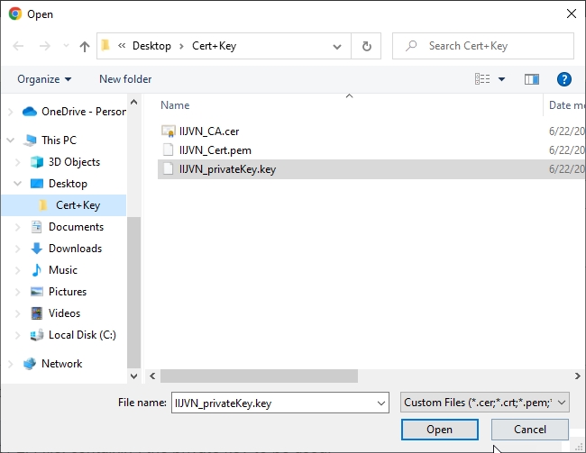 Bước 7: Chọn Private Key của bạn để import vào HI GIO Portal. Nhấn Open.