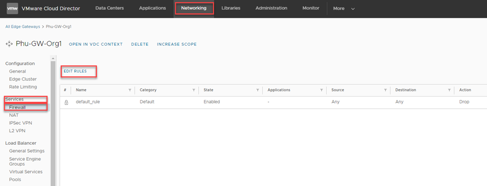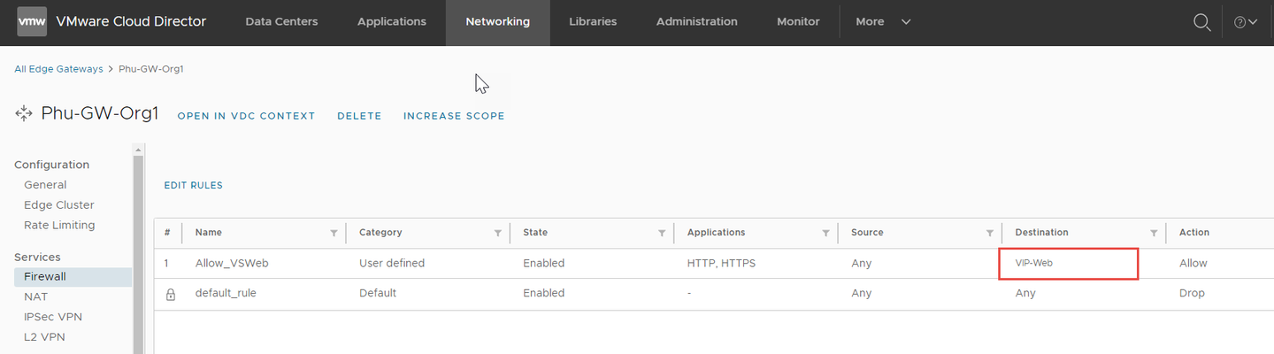 Edge Gateway firewall mặc định trên Tenant được đặt thành Deny all. Chúng ta phải tạo các quy tắc tường lửa cho lưu lượng truy cập đến các virtual service từ internet.
