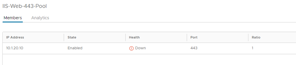 Trong một số trường hợp, trạng thái Virtual Service có thể là DOWN (Health). Chúng ta cần kiểm tra trạng thái của Server Pool để xử lý tình huống này. Ví dụ: IIS-Web-443-VS bị DOWN.