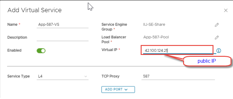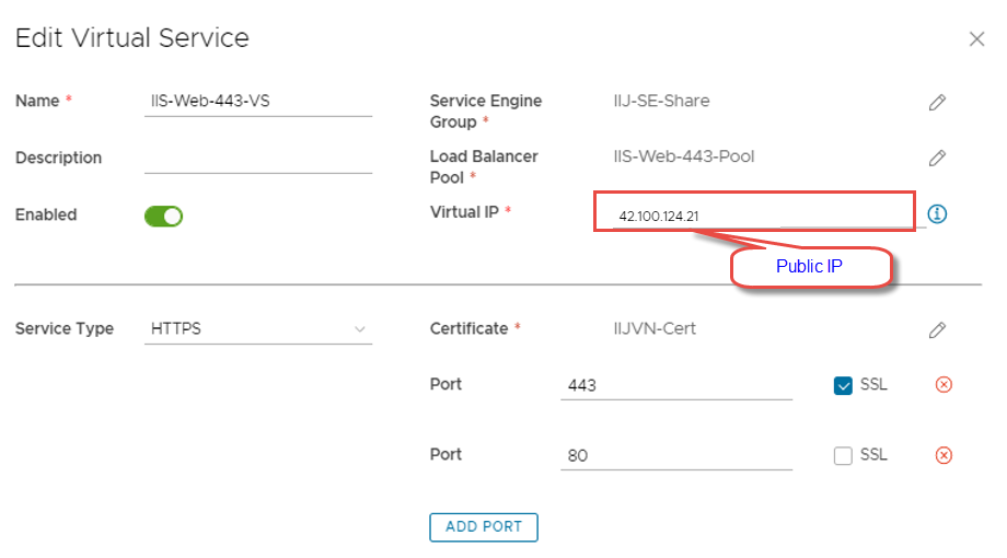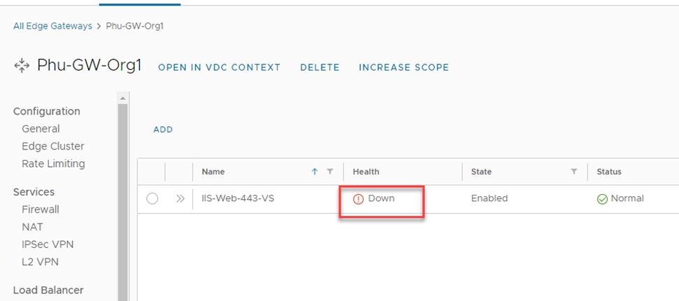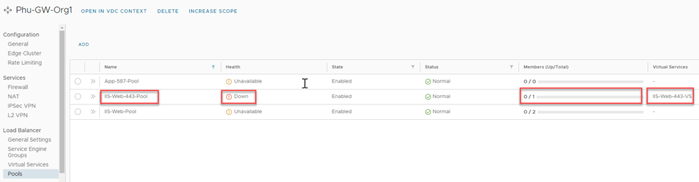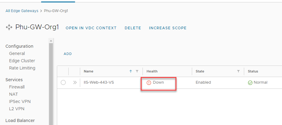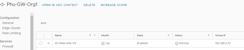 Networking > Edge Gateway > Load Balancer > Virtual Services.