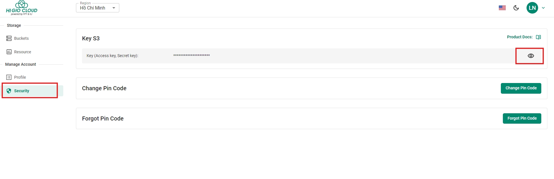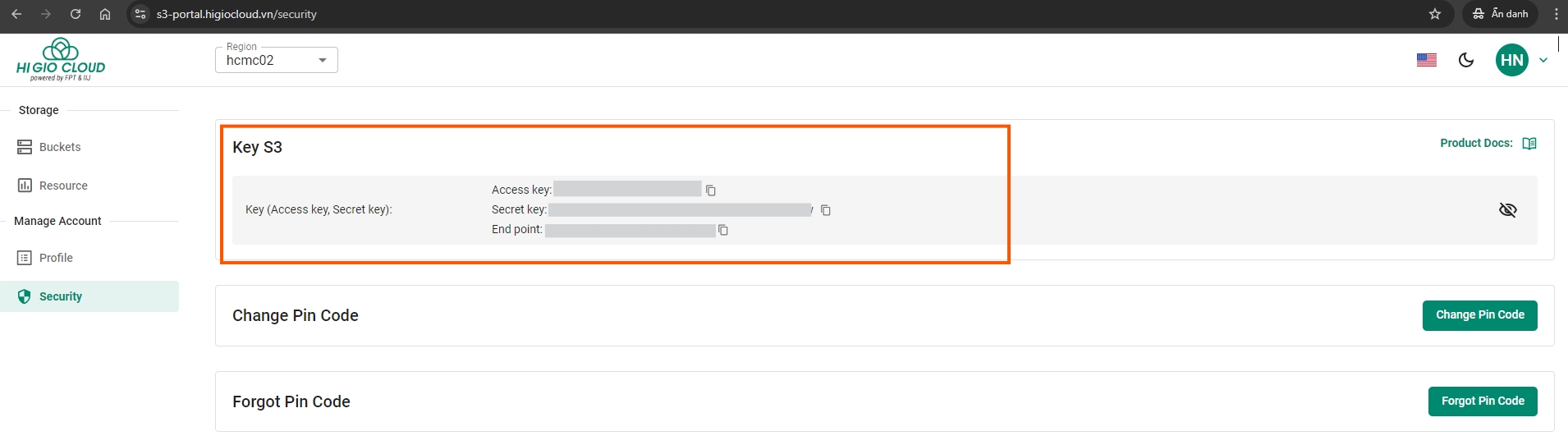 Bước 4: Sau khi đăng nhập vào S3 Portal, hệ thống sẽ yêu cầu bạn tạo mã PIN mới để sử dụng dịch vụ S3. Mã PIN này được sử dụng để xác thực bảo mật khi bạn thực hiện xem S3 Key (Access key, Secret key) hoặc xóa Bucket.